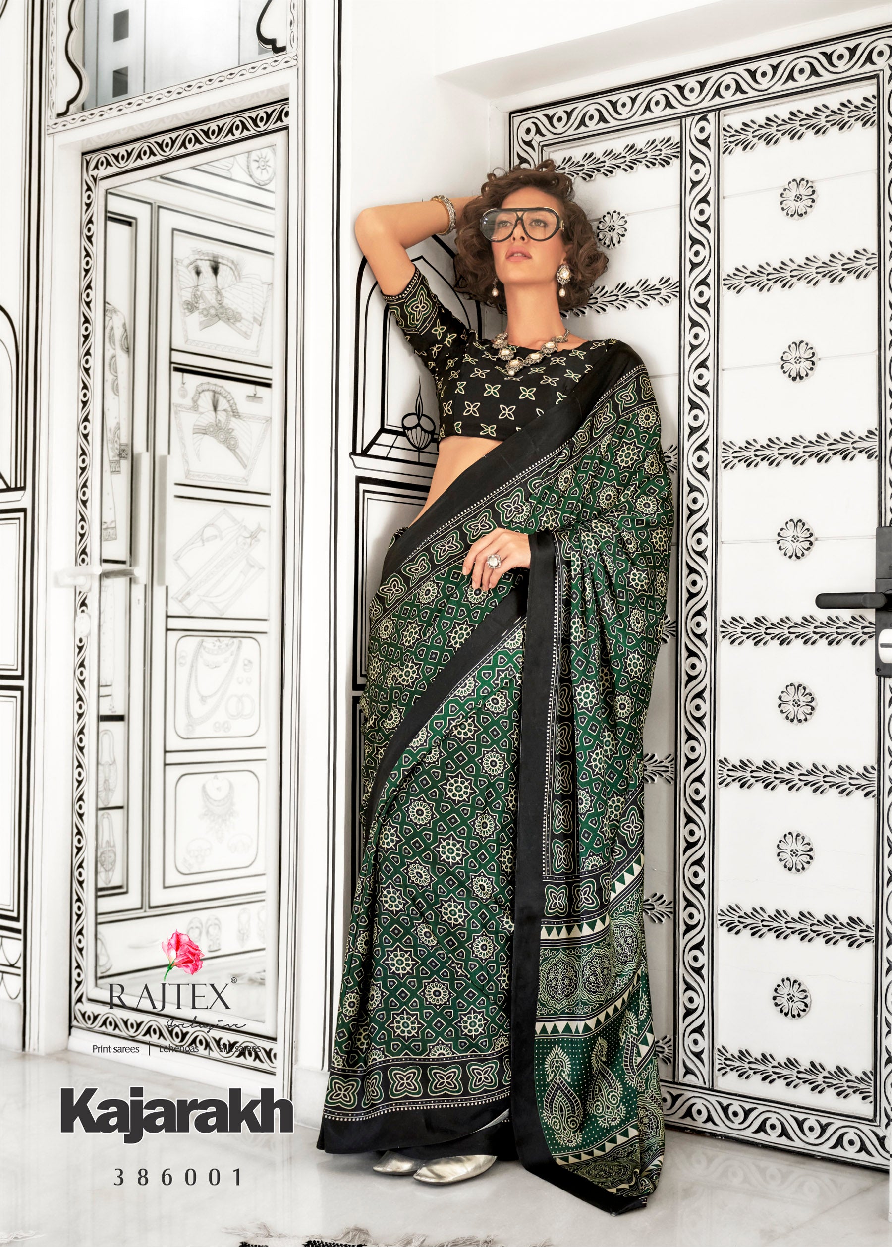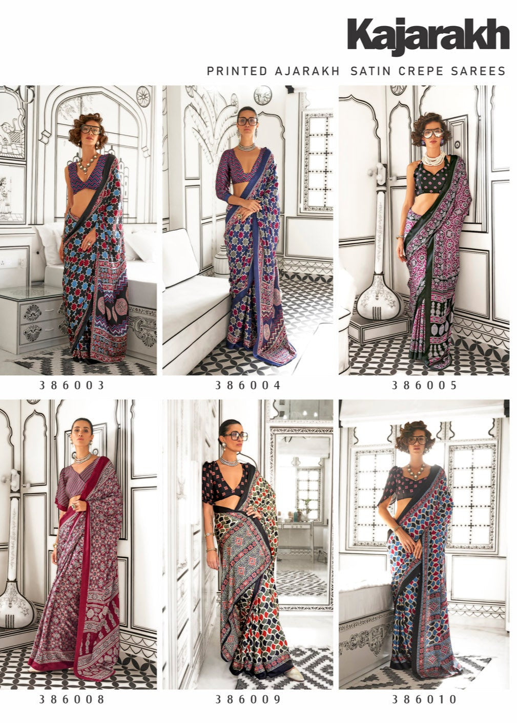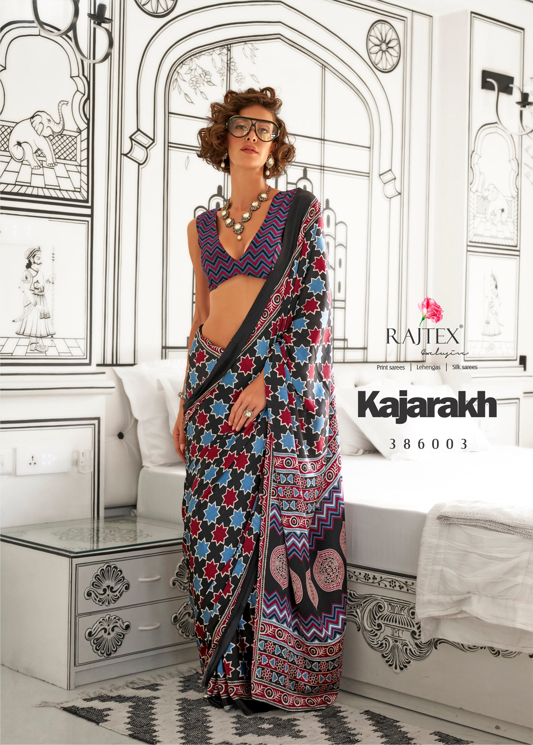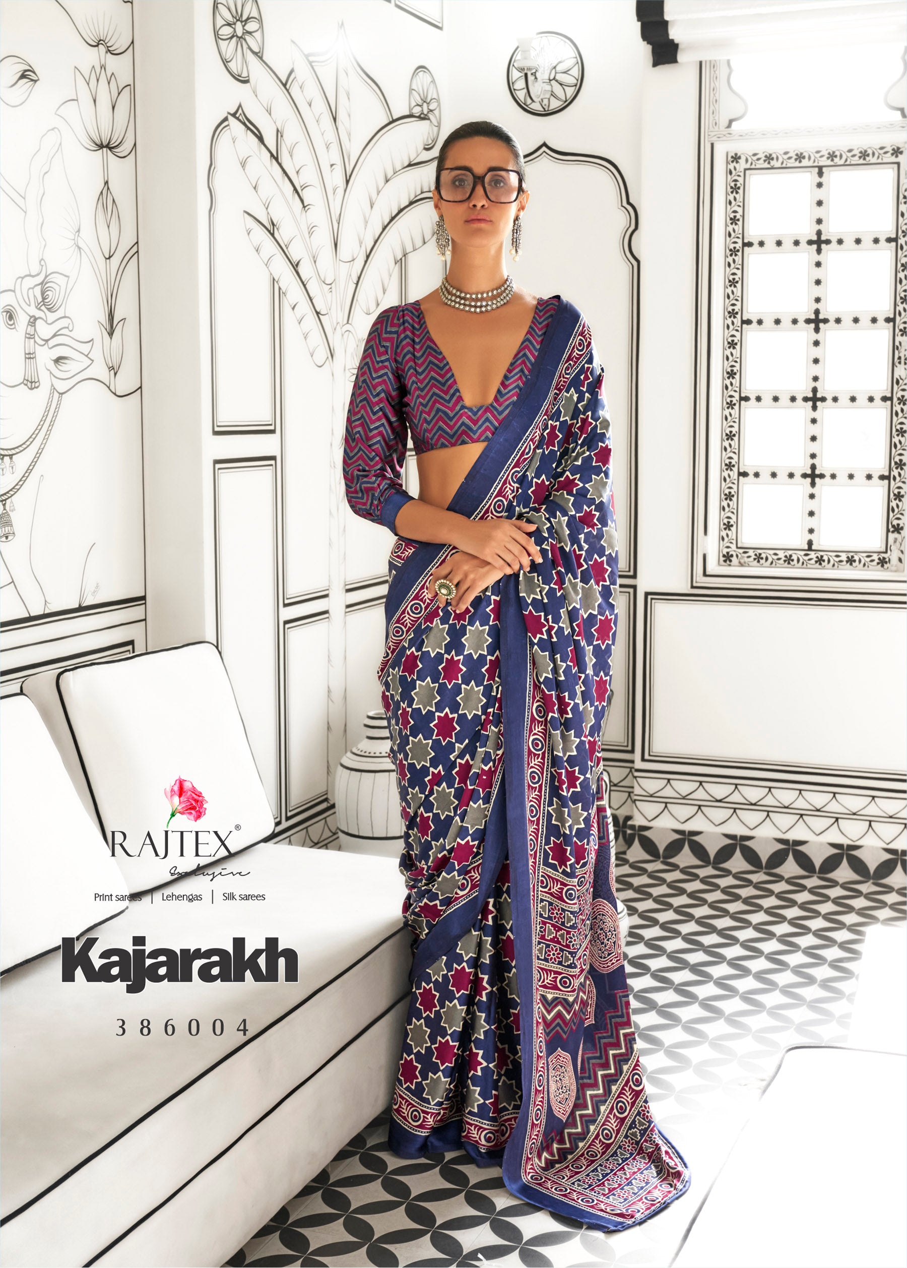 | Fabric | Printed Ajrakh Satin Crepe Sarees |