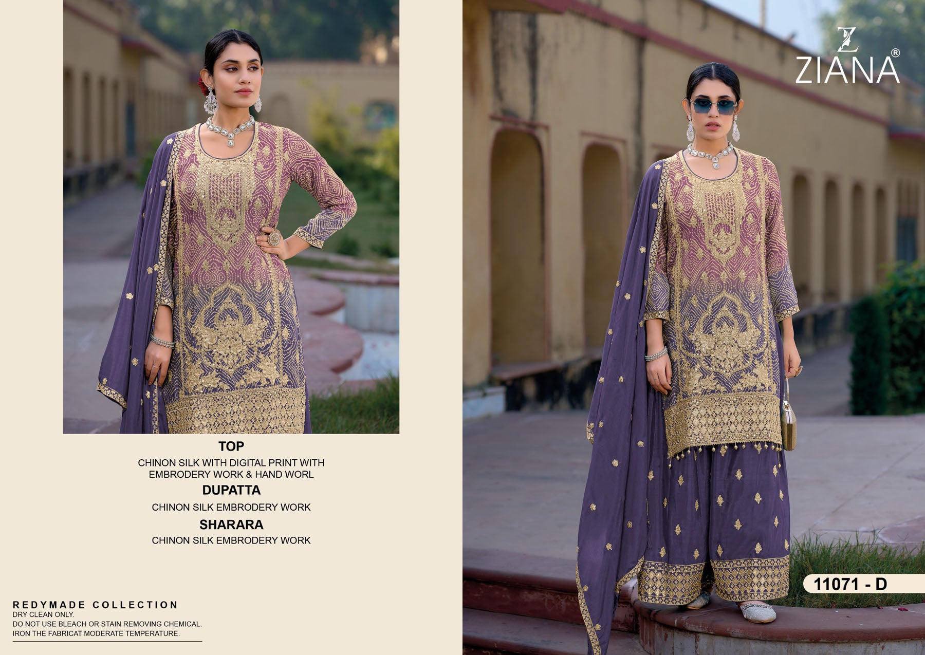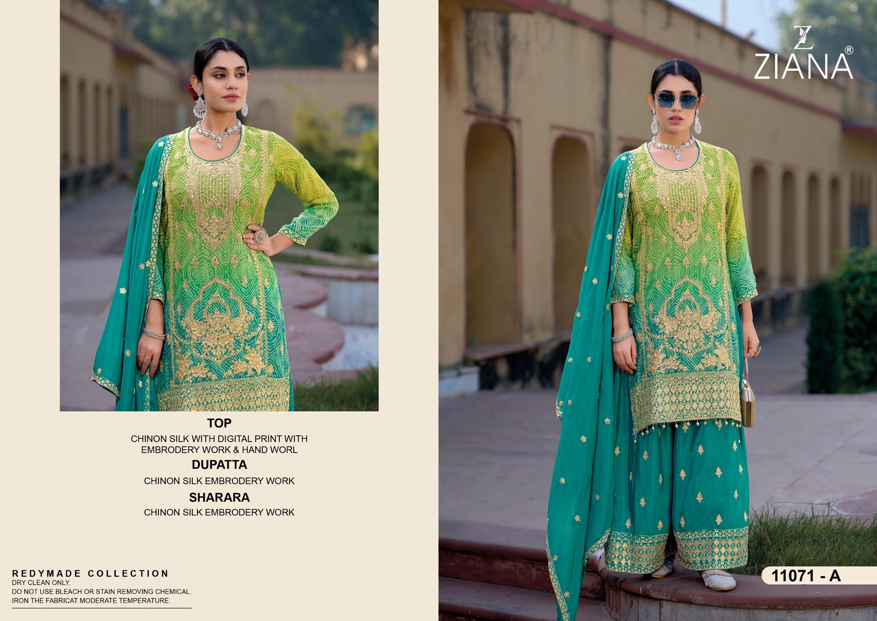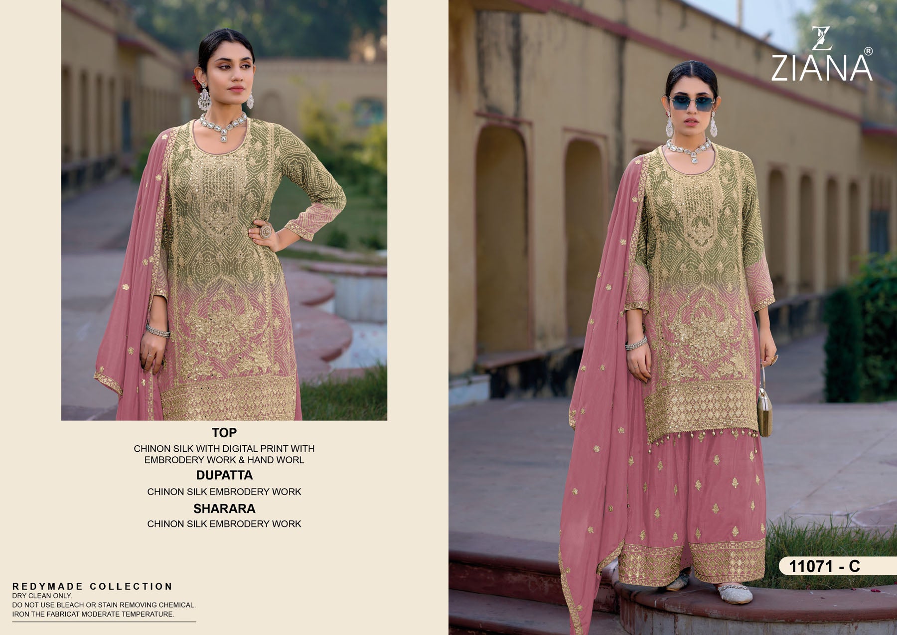 This elegant three-piece set is crafted from premium Chinon Silk, offering a perfect blend of style and sophistication. The top is designed with exquisite digital prints, enhanced with delicate embroidery work and detailed handwork, giving it a rich and graceful appeal. The dupatta, made from matching Chinon Silk, is beautifully adorned with fine embroidery, adding charm and elegance to the outfit. Completing the set, the bottom also features tasteful embroidery on Chinon Silk fabric, ensuring a coordinated and luxurious look. Perfect for festive occasions, weddings, or special gatherings, this set reflects timeless artistry with modern fashion.