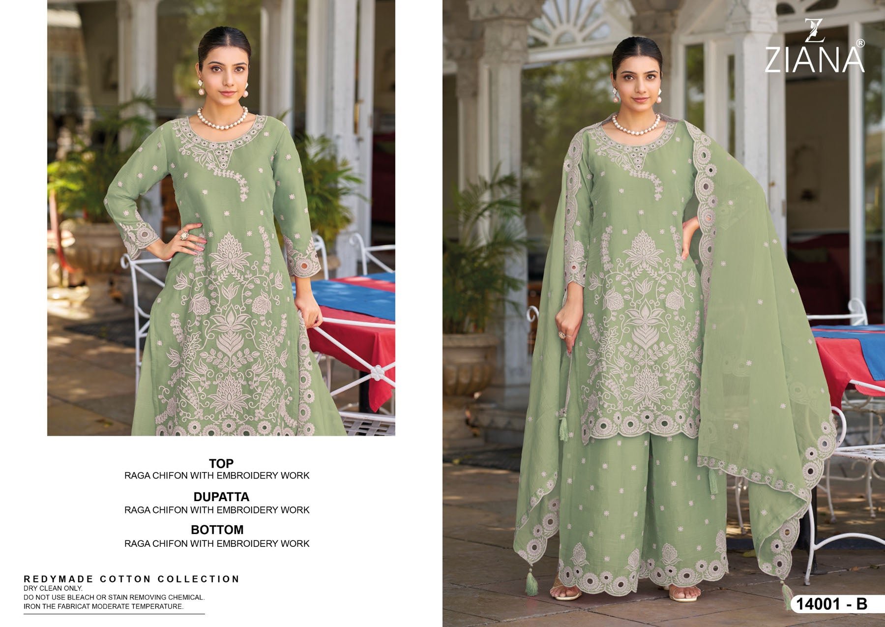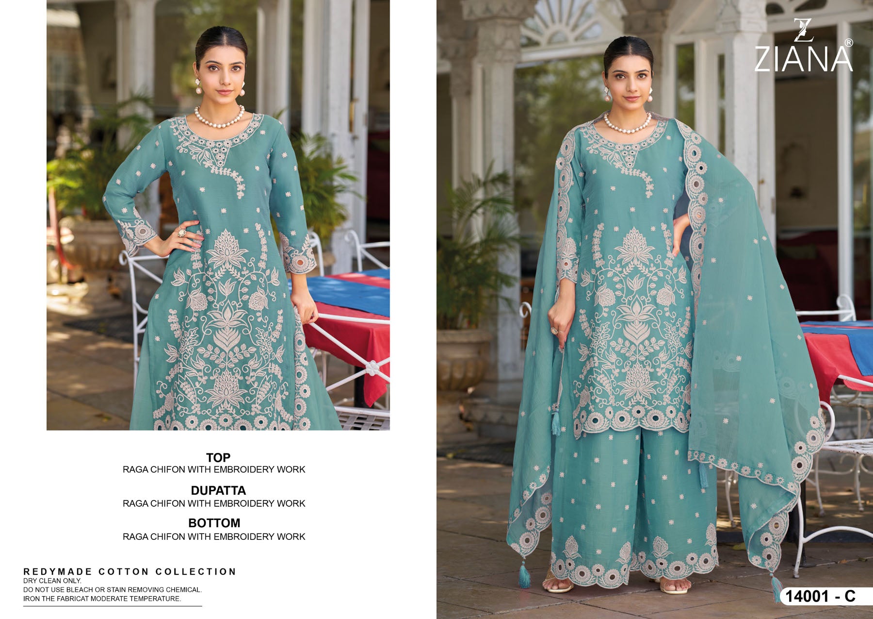 This elegant 3-piece ready-made set is crafted from premium Raga Chiffon, designed to bring charm and sophistication to your ethnic wardrobe. The top features exquisite embroidery work, enhancing its graceful look with delicate detailing. Complementing it, the dupatta is also made of Raga Chiffon, adorned with fine embroidery that adds a touch of richness and elegance. The bottom, tailored from Raga Chiffon with matching embroidery work, ensures a perfect blend of comfort and style. Ideal for festive occasions, parties, or special gatherings, this set offers a timeless appeal, combining tradition with modern elegance for a flawless ethnic statement.