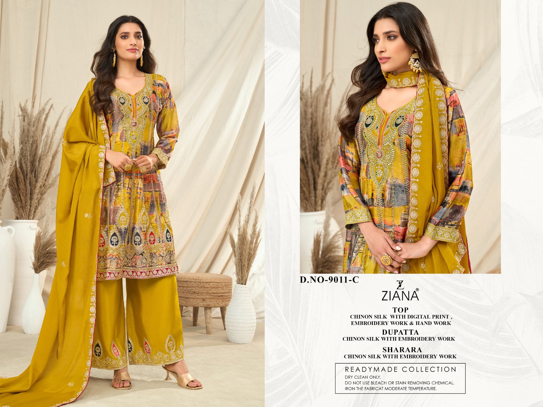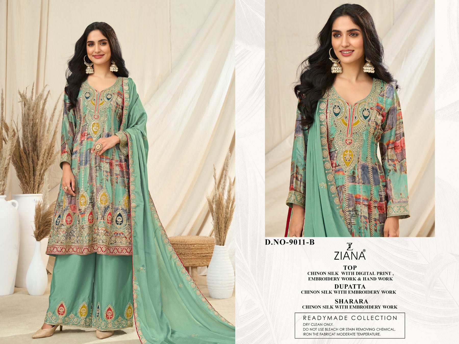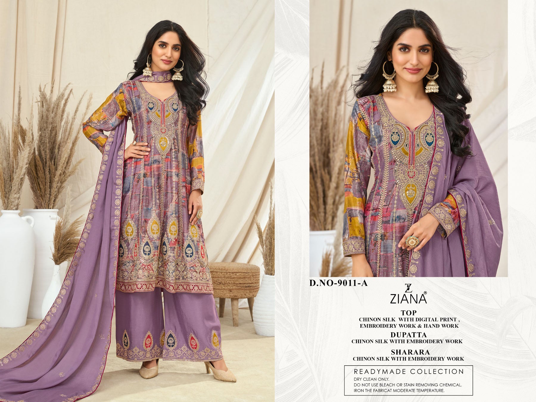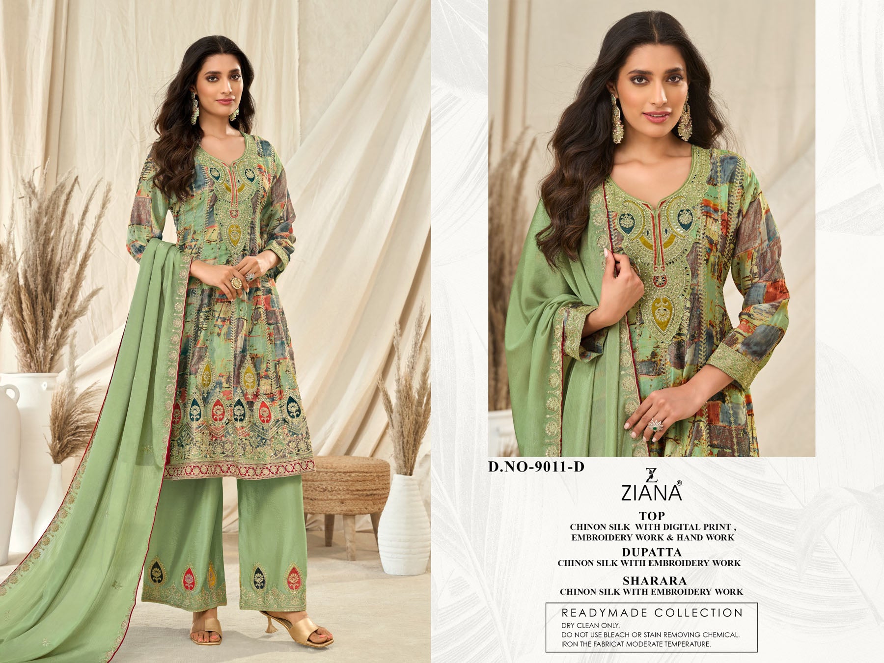 | Top Fabric | Chinon Silk with digital print , embrodiery work and hand work |